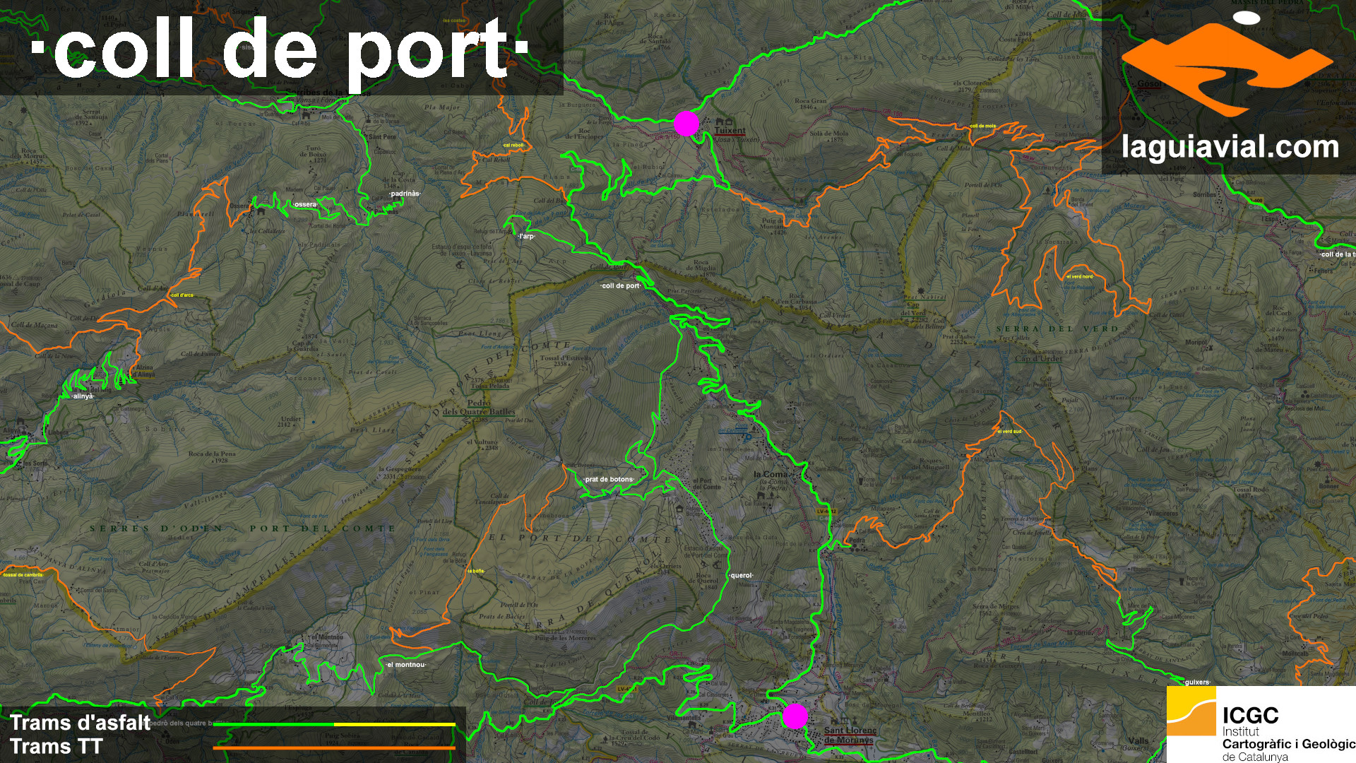 sud: El coll de Port tanca la vall de Lord al nord, la carretera puja sinuosa, ara per la cara est del Port del Compte, ara per la sud de la serra del Verd creuant-se sovint en petites valls suspeses formant graons suaus, Passem dels 925 metres de Sant LLorenç de Morunys als 1668 metres del coll.