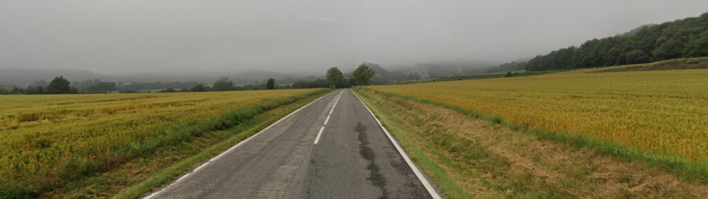 Carretera ample, línies vorals i central, bon asfalt i traçat natural.